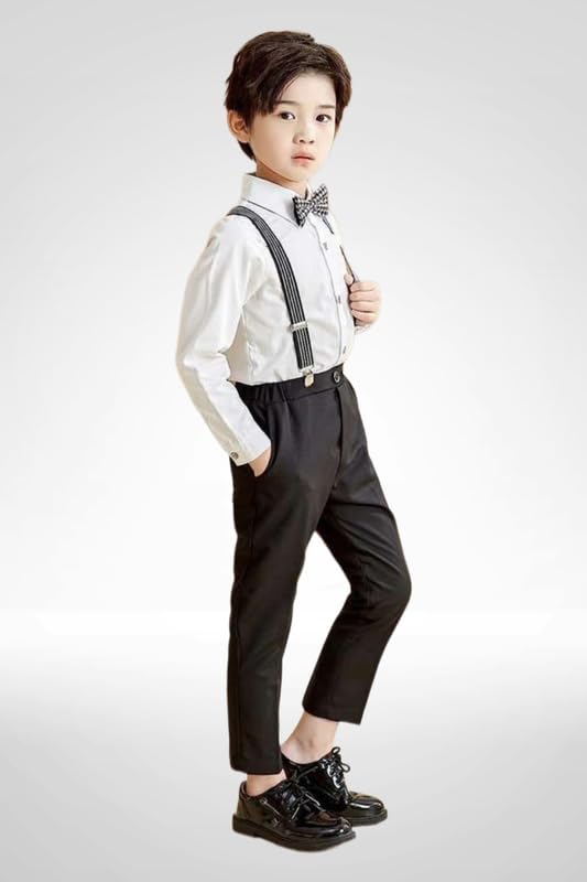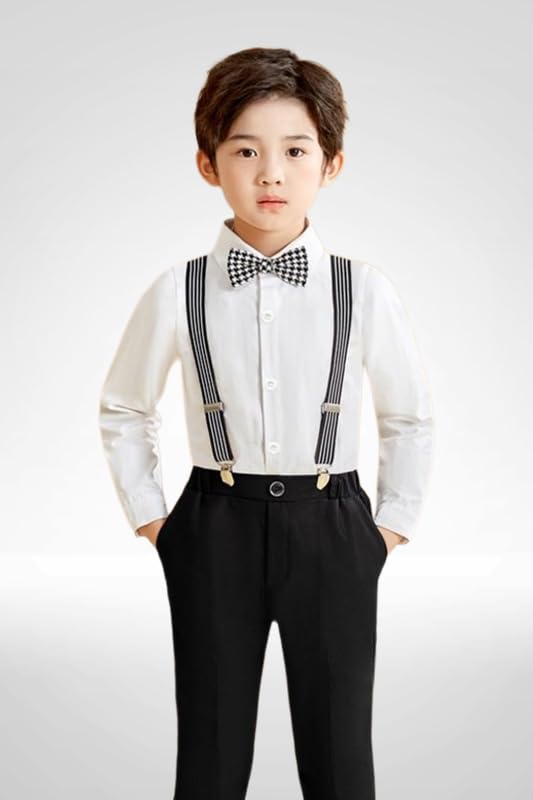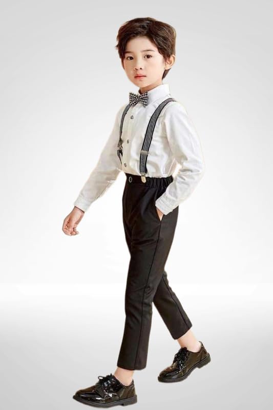 This boys formal dress set is thoughtfully designed as a coordinated outfit that combines timeless style with comfort. The set includes a long sleeve shirt, a smart vest, neatly tailored pants, and a bow tie, offering a complete clothing solution in one package. Each piece complements the other, creating a balanced and refined look that is easy to put together without the need for extra matching. The shirt provides a crisp base layer, while the vest adds structure and depth to the outfit. The pants are designed to sit comfortably while maintaining their tailored cut, and the bow tie finishes the ensemble with a classic touch.Made with fabrics that are soft and gentle on children’s skin, the outfit allows ease of movement so kids can stay comfortable while wearing it for extended hours. The pieces are lightweight yet structured enough to hold their shape, making the set practical for active children. Designed with attention to detail, the stitching and fit help present a polished appearance suitable for memorable events.This set is an excellent addition to children’s wardrobes, offering a go-to option when a neat and stylish appearance is desired. Whether for weddings, birthdays, school functions, or family gatherings, the dress set blends well into various occasions. Beyond its immediate use, the coordinated pieces can also be paired with other wardrobe items, adding versatility and value. Combining simplicity, function, and elegance, this boys formal dress set delivers a complete solution for special dressing needs.