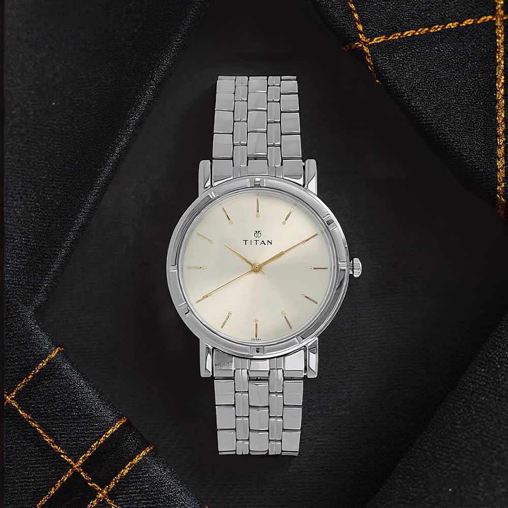 Understated elegance defines the Titan Karishma. A round silver dial serves as a clean canvas for the graceful sweep of gold-toned hands. Minimalist baton markers indicate the hours with subtle refinement. The cool gleam of the silver-toned stainless steel link strap complements the dial, creating a cohesive and versatile look. This timepiece embodies a timeless charm, making it a sophisticated choice for any occasion and refined finishing touch to your ensemble.