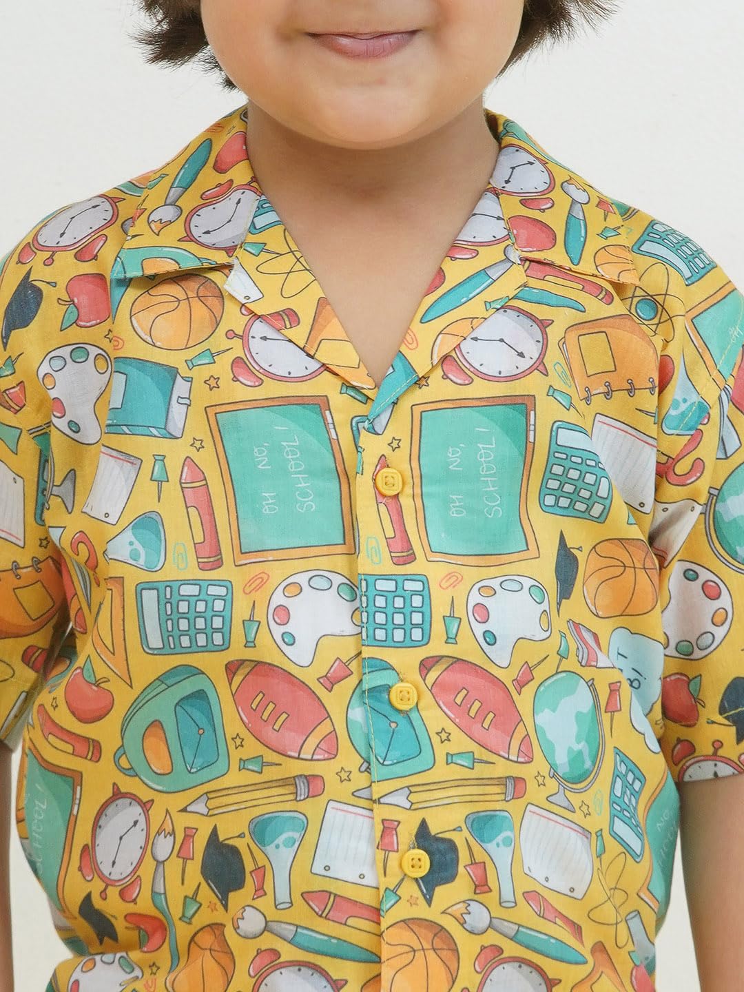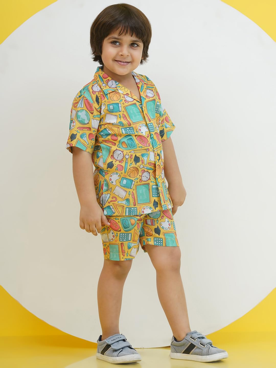 Let your little one shine in this AJ DEZINES Yellow Cotton Funky Print Co-Ord Set for Boys. Made from soft, breathable cotton, this stylish half-sleeve shirt and matching shorts combo features quirky, fun prints that add a playful vibe to his look. Comfortable, cool, and easy to wear—it’s perfect for casual days, playdates, or summer outings.